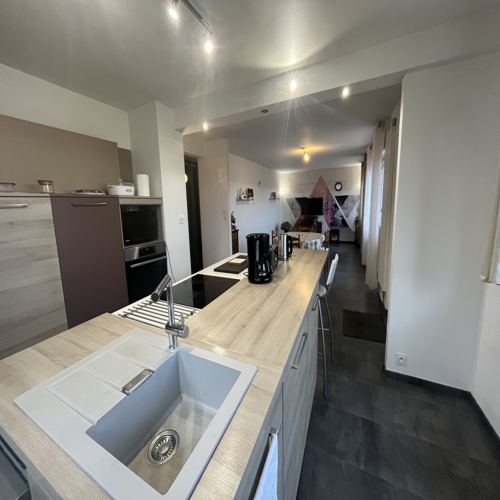 Au rez de chaussée, entrée dans la pièce de vie principale, c'est à dire la cuisine entièrement équipée ouverte sur salle à manger salon, spacieuse pièce de de 47 m² orientée plein sud et disposant d'un accès direct sur terrasse.